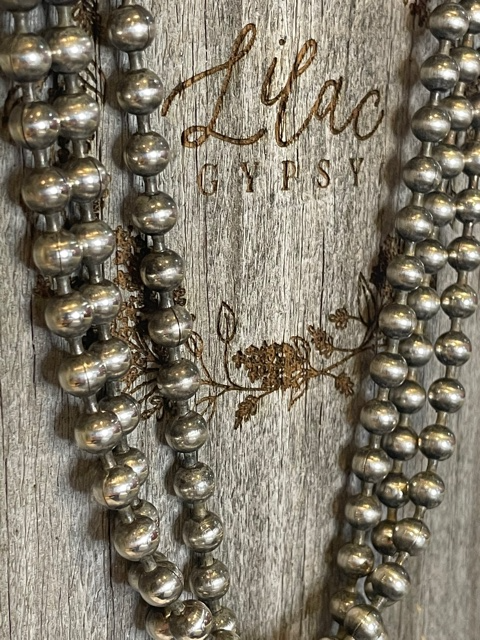 This piece has 16" three strand silver ball chain with a cool hook & eye closure. It can be worn reversed with silver stamping design on the back. The pendant is 2-1/8" long by 2" wide. The turquoise is pretty & colorful!